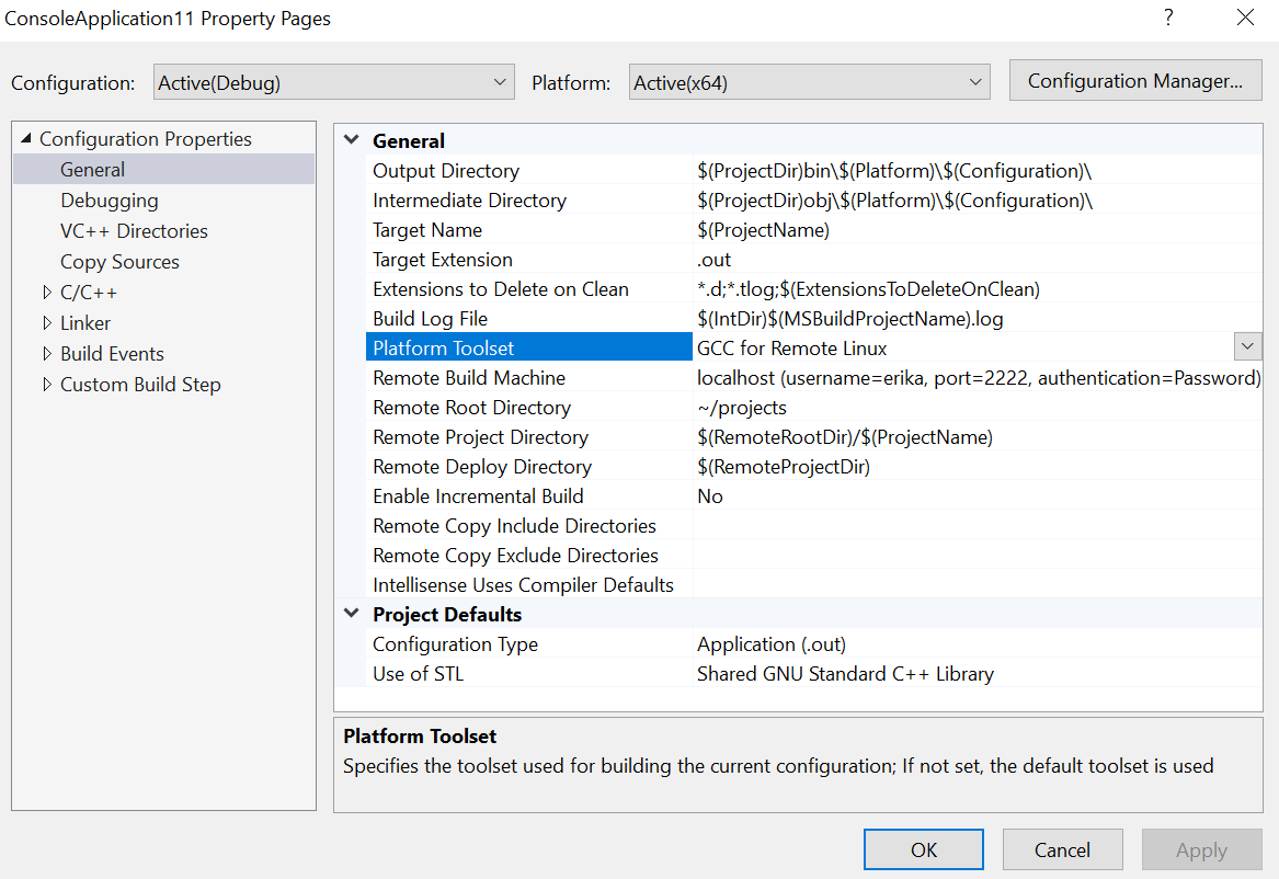 Visual Studio's C++ Property Pages. The option Platform Toolset is selected from the General page.There are four platform toolsets to choose from: GCC for Remote Linux, Clang for Remote Linux, GCC for Windows Subsystem for Linux, and Clang for Windows Subsystem for Linux. Select the toolset that matches your compilers and Linux environment and press OK. The “Remote Linux” toolsets require a SSH connection in the Connection Manager. The “Windows Subsystem for Linux” toolsets use Visual Studio’s native support for WSL and do not require SSH. In this tutorial, I’ll use the GCC for Remote Linux toolset. Check out this tutorial for more information on our native support for WSL.