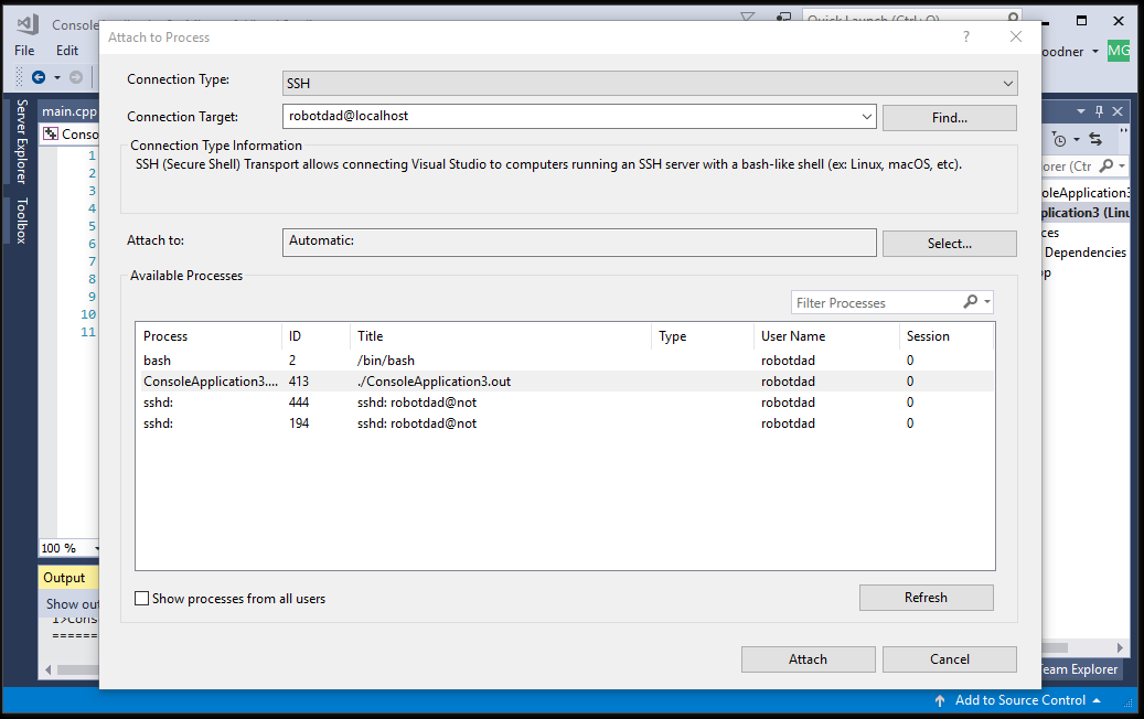 You can even attach to processes on your Linux machines to debug problems live. Open the Debug menu and select Attach to Process. As shown in the screenshot below select the SSH Connection type. You can then use the drop-down target menu to select a Linux machine. This will then enumerate the remote connections you have previously created.