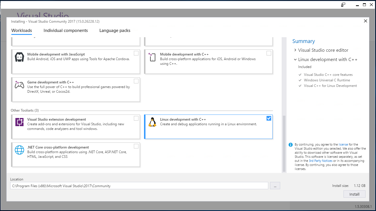 Visual Studio 2017 and 2019 include the C/C++ Linux Development workload. To install it, start the Visual Studio installer and choose to either install or modify an existing installation. Scroll to the bottom. Under the section “Other Toolsets” you will find Linux Development with C++. The workload installs in under 10 minutes. Learn more about installing the Linux development with C++ workload in our documentation.