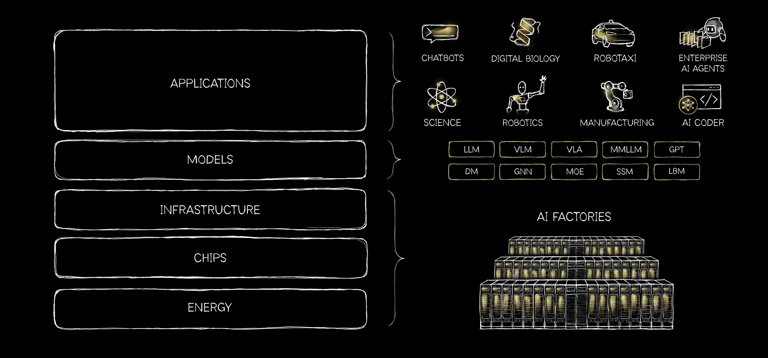 基礎設施之上是模型層。AI 模型能理解多種類型的資訊,包括語言、生物、化學、物理、金融、醫療,以及真實世界本身。語言模型只是其中一種類型。目前最具變革性的進展,正發生在蛋白質 AI、化學 AI、物理模擬、機器人技術,以及自主系統等領域。