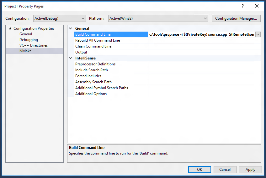 We will use pscp from PuTTY for this in combination with our parameters from the build tab for the private key, user, host and remote working directory. When you are copying files this way to a Linux host make sure the remote directories you are using already exist. Next we’ll specify the build command line with the remote executable name as commands passed via plink. Note here if there are spaces in your parameter values you should escape them with quotes. We specify these on the build command line of the Nmake tab of the project properties.
