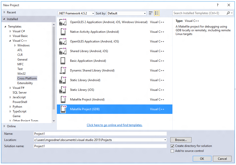 After you’ve installed the extension, create a new project and you’ll find a new template for Makefile Project GDB) under Visual C++, Cross Platform.