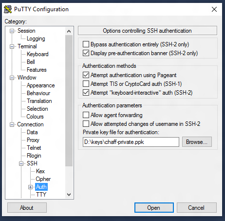 To connect from PuTTY, load your saved session and then go to Connection, Data and set your user name. Now under Connection expand SSH and under the Auth node add the private key you saved. Go back to the session page and save it. Now you can open a session using keys without a password. Simply double click the session name to open it.
