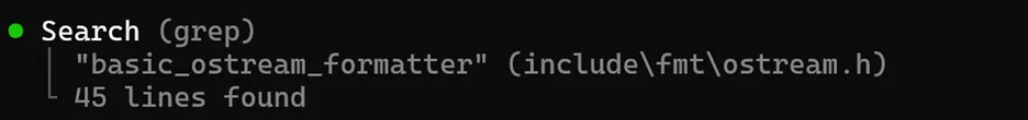 A screenshot of the Copilot CLI calling grep on basic_ostream_formatter.