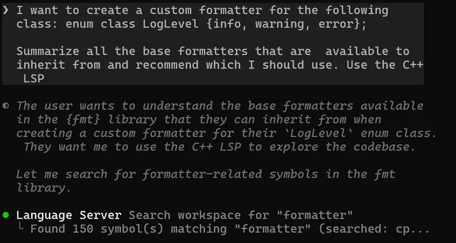 C++ is difficult for tools to reason about: complex include hierarchies, macros, templates, overloads, and build-system-dependent configurations mean that text search alone can give incomplete or misleading results. The Microsoft C++ Language Server provides the GitHub Copilot CLI with precise semantic data – including symbol definitions, references, call hierarchies, and type information – to complement grep-style search. Let’s look at an example using {fmt}, an open-source formatting library.