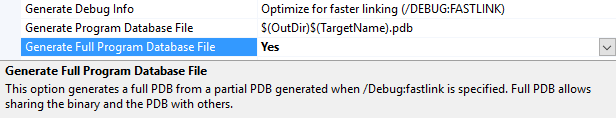 In order to be able to debug with this PDB sharing scenario in mind, the current way to fix this is to generate a full PDB before sharing using the ‘Generate Full Program Database File’ option in the Linker-> Debugging property page (figure below). When this option is set to ‘Yes’ on hitting build we will currently perform a minimal build which will relink and overwrite the partial PDB with the full PDB, in the future however instead of re-linking a new tool will be called which will collect and process debug records from all input OBJs, static LIBs and compiler generated PDBs, and then overwrite the partial PDB produced by the linker with /DEBUG:FASTLINK. This process will be substantially faster than relinking and the resulting PDB will contain all relevant debug info for the binary as if it was linked with /DEBUG. In addition to this we will be adding support to specify the paths the object files in a future update, but in the current release this is not supported.