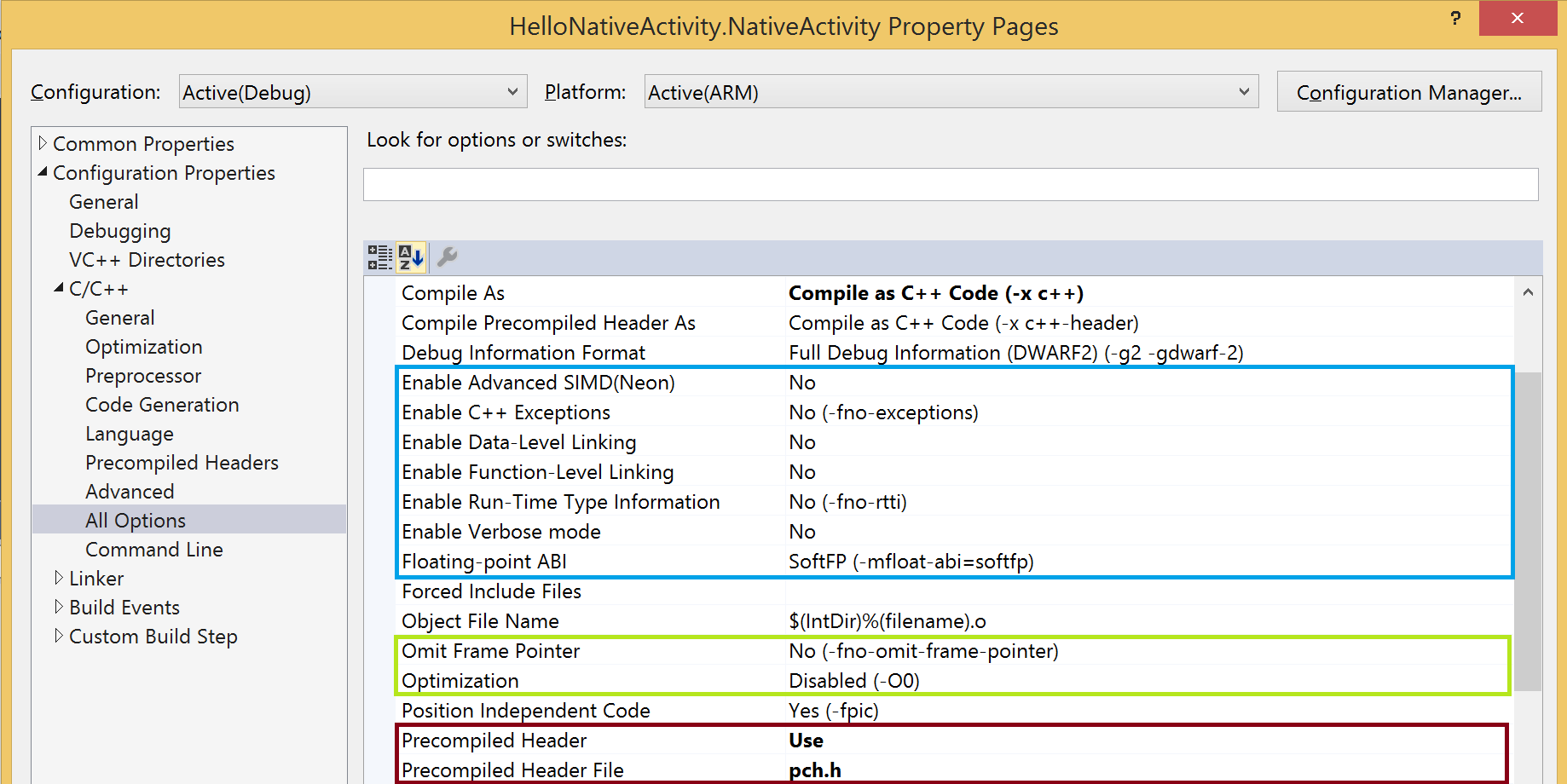 Exploring the property pages for the NativeActivity project users can set project properties such as the target Android API Level, Name of the library and the platform toolset. Notice as a part of our cross-platform mobile enablement we have added support for the CLANG toolchain (made available from the Native Development Kit (NDK)) when targeting the Android platform. This includes adding support in the property pages for easily providing compiler build flags for ‘Code Generation’, ‘Optimization’ and even the use of ‘Precompiled Headers’.
