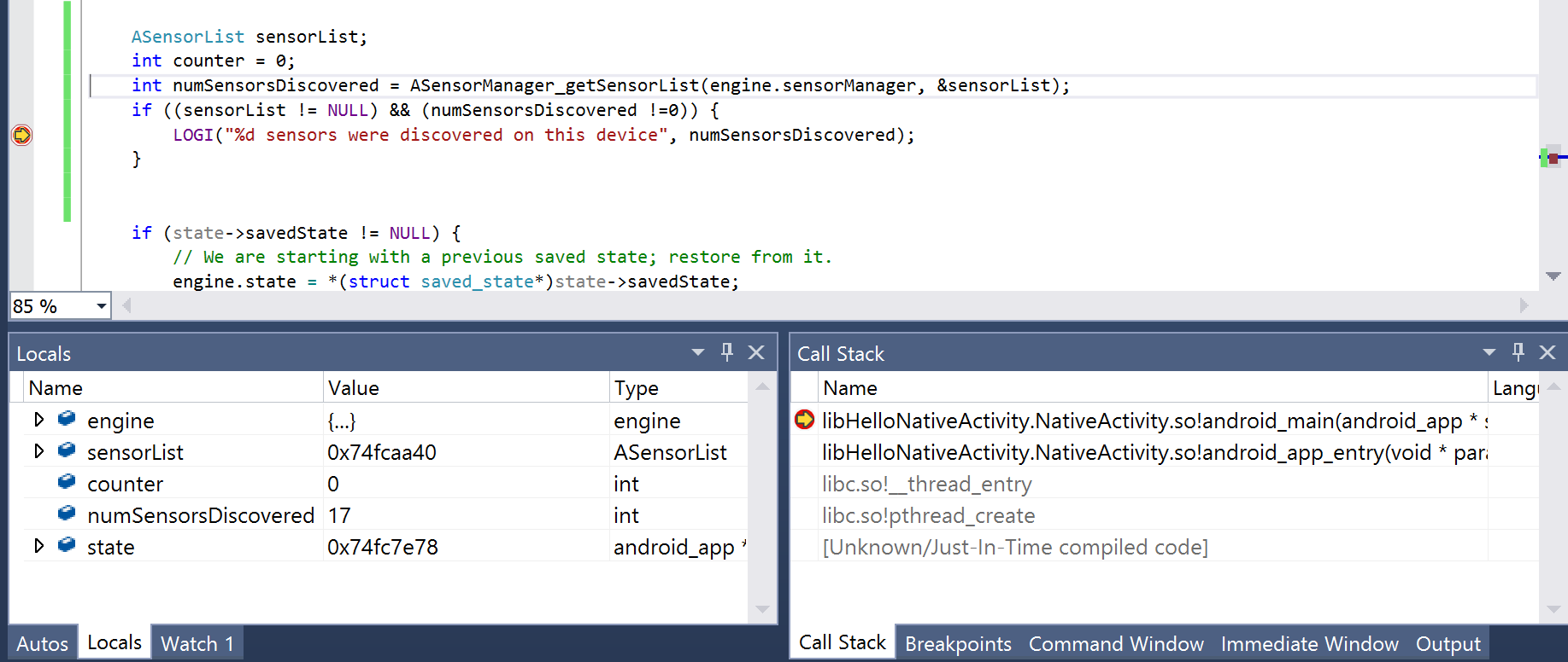 Next let us explore the source for our NativeActivity application. Let’s start with main.cpp source file, ‘android_main’ function is the entry point function for any native-activity application and is running the event loop for receiving input events and doing other things. Let’s edit the source to log the number of sensors available on a particular debug target (emulator/device) by adding the following code section and build. You can add this code segment before the ‘if (state->savedState != NULL)’ conditional block start.
