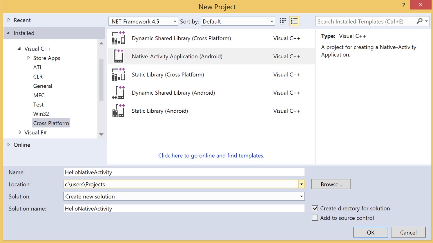 In order to get started with creating Native Activity Applications please grab the cross-platform mobile tools required which enable this experience. If you haven’t done so already please refer to this post which walks you over the acquisition experience. Once the tools have been acquired let us start with creating the OOTB Native-Activity Application, for doing so choose the Native Activity Application template available under the ‘Visual C++ – Cross Platform’ node.