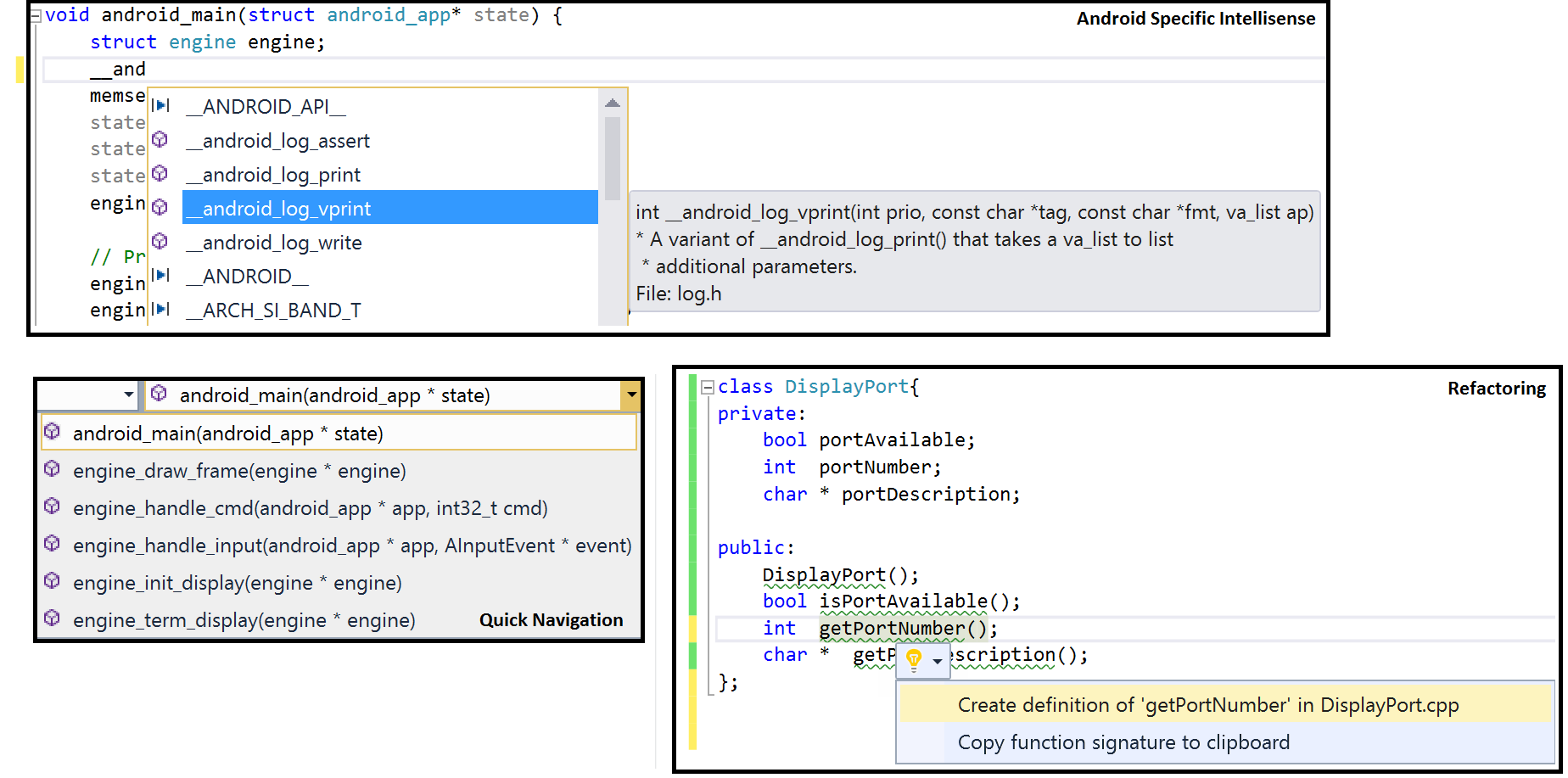 The cross-platform mobile experience is designed for a fast edit-build-debug cycle. As a part of this experience full intellisense support has been introduced for Clang toolchain when targeting the Android platform. This is in addition to other common code authoring features such as refactoring, quick navigation and others. The figure below depicts these various features in play.