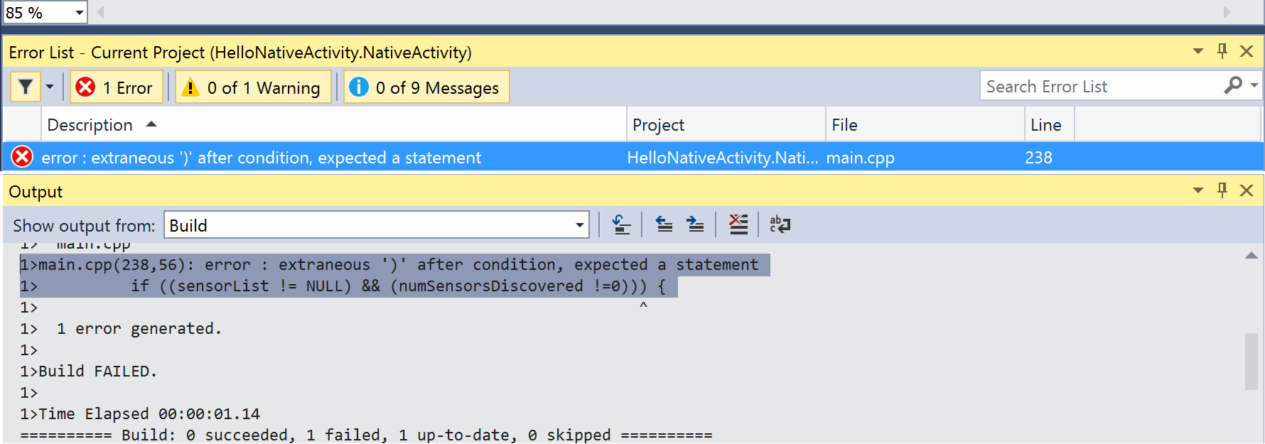 This code section has a bug to demonstrate the work that has been done to provide diagnostic support with Clang’s well known features such as Fix-It and others at play (shown below). In this particular case the code section we added had an extra parenthesis on the line highlighted above and once it’s edited out the application builds correctly.