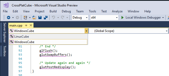 In Visual Studio 2017 we introduced the Linux development with C++ workload. This tutorial is going to walk through some of the improvements we have made in the 15.2 release using the classic spinning cube demo from Julien Guertault’s OpenGL tutorial. We have shown how to use this OpenGL demo in our Linux workload before. What we are showing here is how to use this as a single source base for both Windows and Linux using Shared Items in Visual Studio. From there we will show off some improvements we have made to debugger type visualization for Linux C++, for both natvis and Python pretty printing.