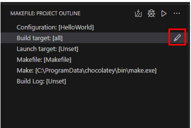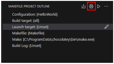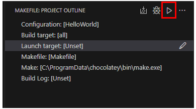 To run/debug your program, use the pencil icon to select a Launch target. A configuration for the selected target will be added to the makefile.launchConfigurations setting. If you need to pass additional arguments to your targets, add the binaryArgs property to the target’s configuration in makefile.launchConfigurations. You can also set MIMode, miDebuggerPath, and stopAtEntry in makefile.launchConfigurations.