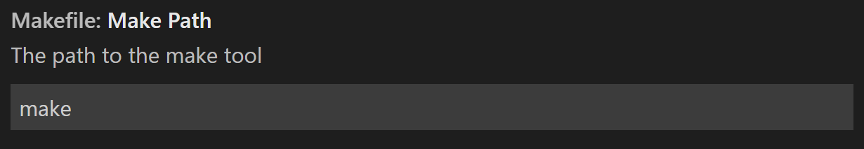 By default, the extension will attempt to use a make program that resides within your $PATH to configure the project. If your make.exe is not in your $PATH, update the Make Path setting by going to File > Preferences > Settings and then selecting makefile under Extensions. The Make Path setting tells the extension where to find your make executable.