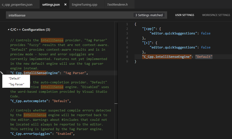 In this update, we’re shipping Error Squiggles and Quick Info as “experimental features”. What this means is that they are turned on by default only for those using VSCode Insiders, and off by default for anyone else. You can enable or disable the features by toggling the setting in the settings.json file (File->Preferences->Settings). In the settings file, search for “intellisense” to locate the C_Cpp.intelliSenseEngine setting, and set it to “Default” to enable the new IntelliSense Engine (see the following screenshot). “Default” will become the true default for everyone when these features exit their experimental state. 🙂