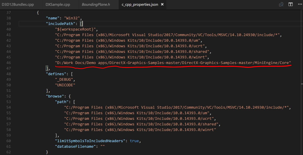 Clicking on Vector3 in the code, you will see a light bulb on the left side of the line. The “Add include path to settings” menu on the light bulb will take you to the c_cpp_properties.json file in which you can specify the include paths for IntelliSense. If the c_cpp_properties.json file does not already exist, it will be created and populated with the following default include paths: