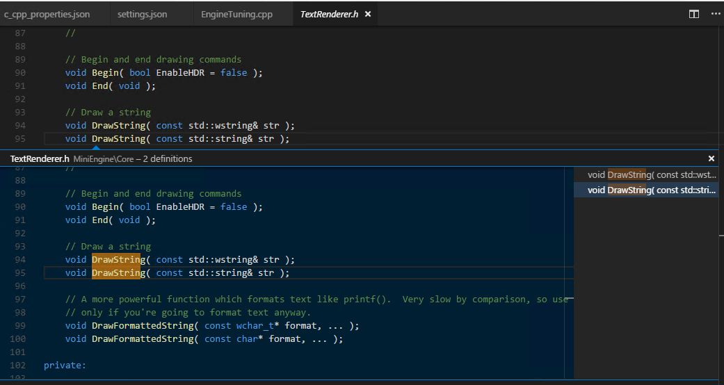 In the next screenshot, you can see that the “TextRenderer.h” file is open and the two DrawString function declarations are being highlighted.