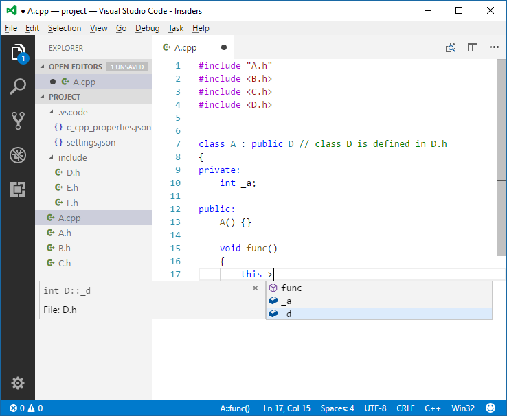 Today we are excited to announce the release of the June 2017 update of the C/C++ extension for Visual Studio Code. This update enables semantic-aware member list auto-completion and improves the overall default IntelliSense behavior, providing a smoother out-of-box IntelliSense experience.