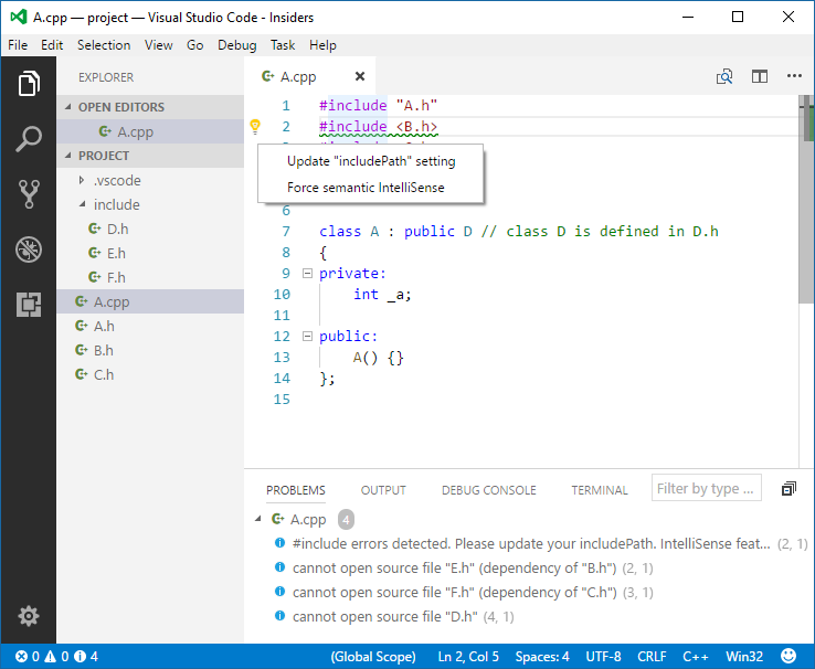 The extension first tries to fully parse any opened file using the new IntelliSense engine. If it discovers that it cannot find a header file or a dependency, it will fall back to the tag parser and provide the original fuzzy IntelliSense behavior. The fallback affects a full translation unit (TU), not just a single open file. Other opened TUs will continue to use the new IntelliSense engine provided that all #include dependencies are resolved. This behavior effectively addresses the “sea of red squiggles” many users saw in the May update by only showing green squiggles for any #include statements that could not be resolved. The Problems panel provides details about unresolved headers and dependencies.