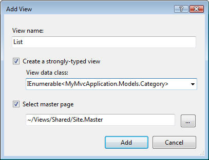 This brings up the Add View dialog, which allows you to specify a View Name (defaults to the name of the Controller action method), and optionally a ViewData type and Master Page. When specifying a ViewData type, you can either pick from a dropdownlist of available types referenced by the project, or you can type a custom value directly. In the example below, I have typed IEnumerable<MyMvcApplication.Models.Category>, because I want to display a list of Categories instead of a single Category. Note that you may need to Build your project first before types will appear in the ViewData dropdown.