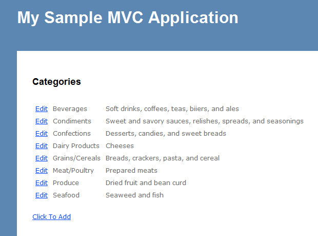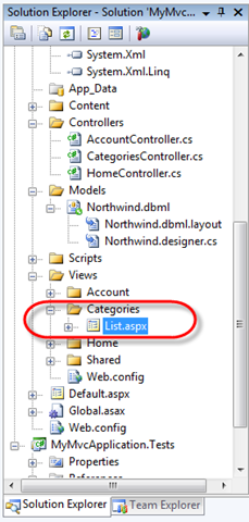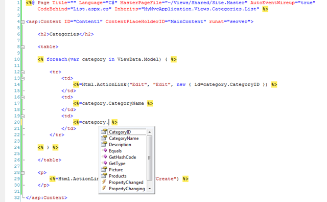 Upon confirming the Add View dialog by clicking the "Add" button, a new View page is added to the project. Notice that it is placed automatically under the correct Views subfolder, named according to the Controller class (~/Views/Categories, in this example).