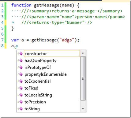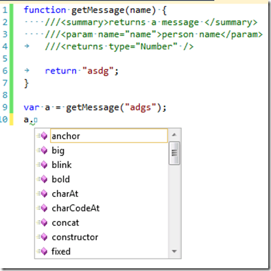 2. Sometimes, the JavaScript engine may meet an exception internally during dynamic function execution in the current or referenced document. The cause could be a JavaScript function syntax error, logic bug, or the VS2010 JavaScript engine bug. The corresponding IntelliSense at this time will be shown as a simple object or not shown at all. To support good IntelliSense behavior in this case, try build a VSDoc file, add XML comments and remove the offending code.