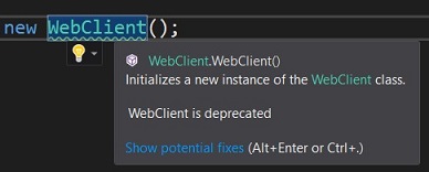 The .NET Framework is a large product that is getting constantly upgraded to better serve customer needs, implement innovative approaches, and fix issues. So it’s natural to deprecate some APIs and replace them with new ones. For example, we have build three versions of the .NET Framework networking stack. The latest version, HttpClient, is intended to replace WebClient and HttpWebRequest. As a developer, how do I know that I should use HttpClient instead of WebClient? There is documentation, but we usually look in documentation only after we face some problems, when code is already implemented with an old API and refactoring is annoying. So it is very beneficial to be prompted that you’re using a deprecated API at its first appearance in your code.