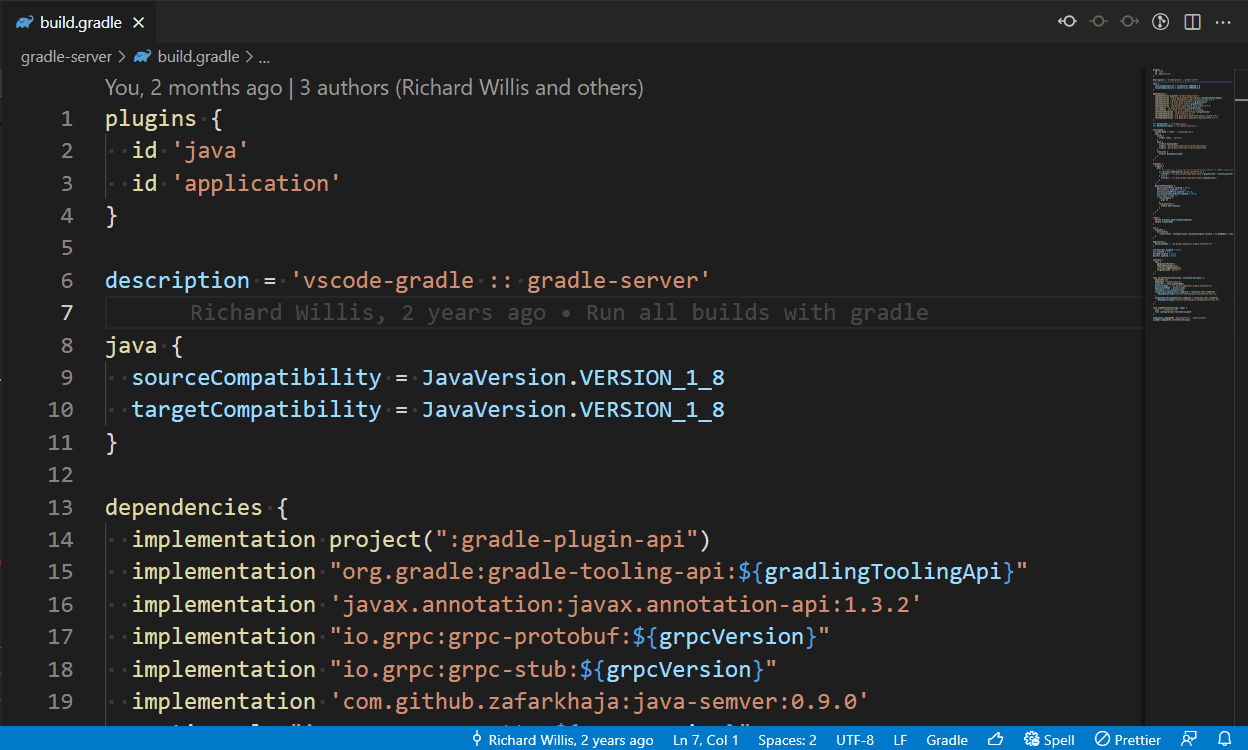 The Gradle language server supports basic auto completions for a Gradle file, when you’re trying to type a Gradle closures or properties in a Gradle script, the extension will automatically suggest available Gradle closures for you.