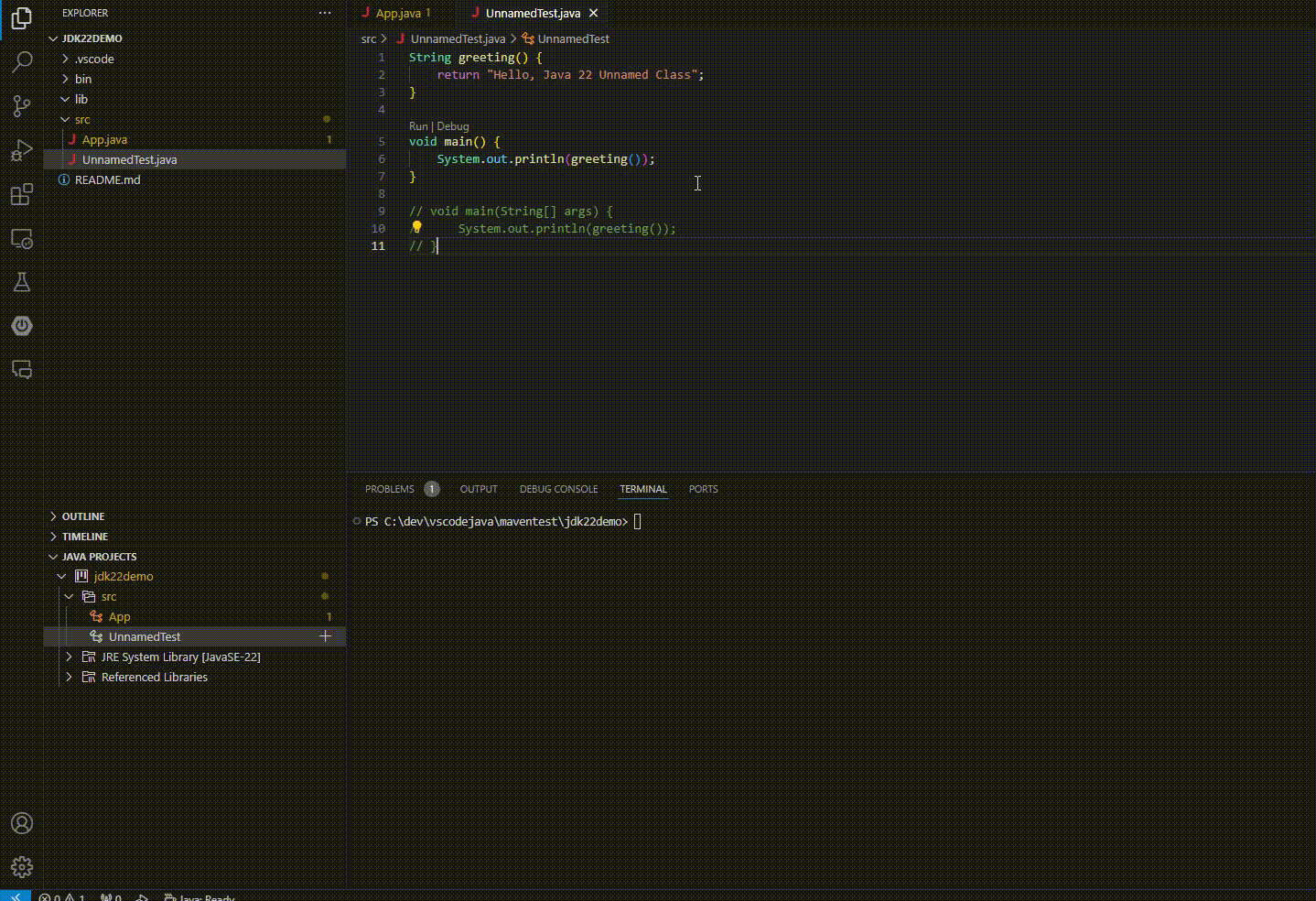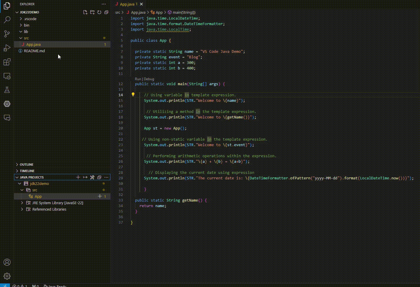 您已经可以在 Visual Studio Code 中使用 JDK 22 了。所有语言特性现在都得到了支持,以下是一些要点特性: