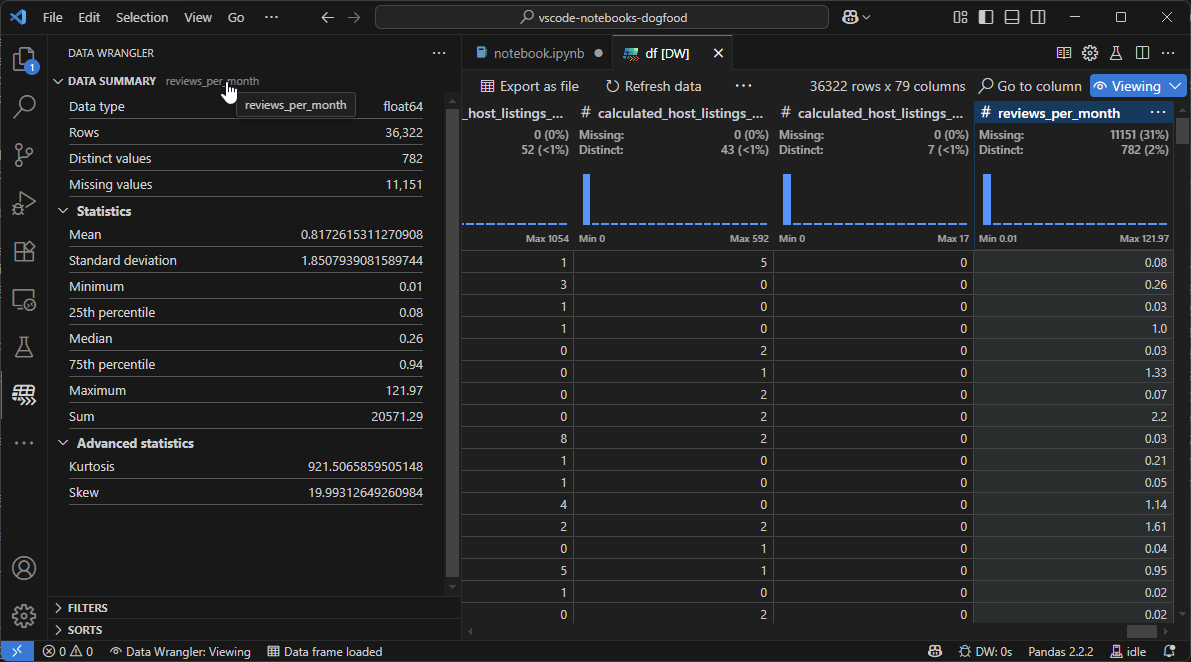 Check out how Data Wrangler integrates seamlessly with notebooks in VS Code to enable you to answer these questions quickly and easily, with just a few clicks.