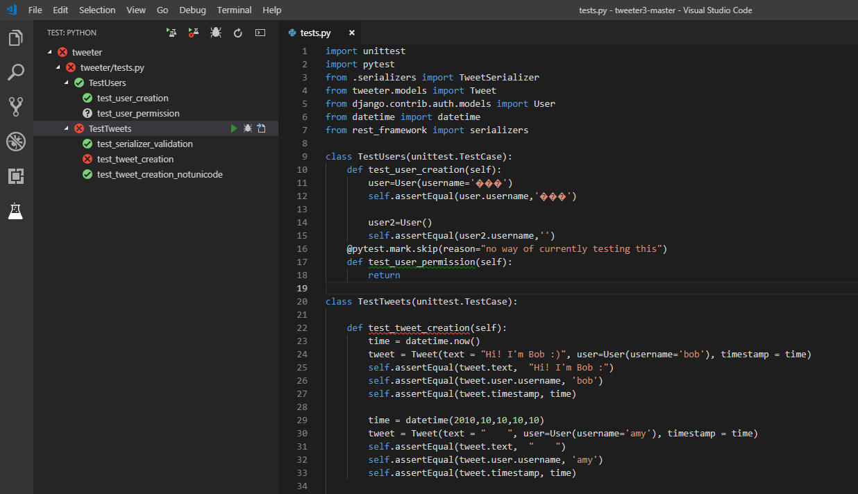 As a reminder, you can try the Test Explorer out by running the command Python: Discover Unit Tests from the Command Palette (View > Command Palette). If the unit test feature is disabled or no test framework is configured in the settings.json file, you’ll be prompted to select a framework and configure it. Once tests are discovered, the Test Explorer icon will appear on the Activity Bar.
