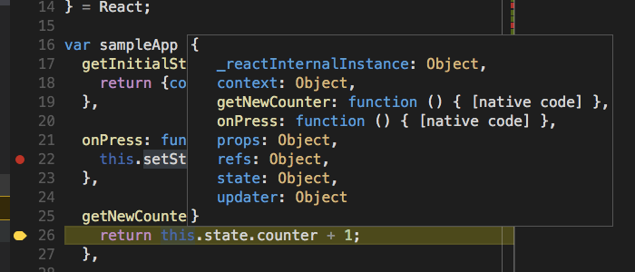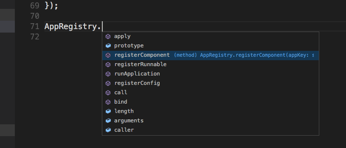 • Syntax highlighting and autocomplete capabilities for both JavaScript statements and JSX snippets in the source files. Syntax highlighting and autocomplete for ReactNative in Visual Studio Code