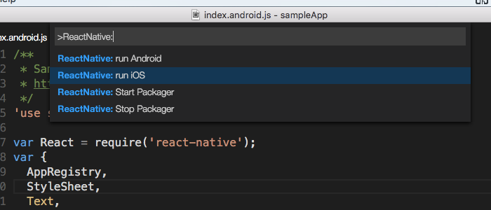 Then visit the Visual Studio Code Marketplace to get the ReactNative extension. You can also install it directly from within the editor. Simply invoke the Command Palette (Cmd+P on Mac, Ctrl+P on Windows), type >ext install reactnative, and hit Enter.