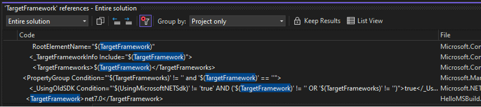 The new MSBuild editor provides Quick Info not just for XML elements in MSBuild files, but also for properties, items and metadata in MSBuild expressions. The Quick Info popup is richer, and has deep links to relevant documentation, as well as hyperlinks to references in other files that may help you understand how that property or item is used by the underlying targets.