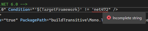 The MSBuild Editor’s validations go beyond just XML validation. It overlays a type system onto MSBuild, so you will get errors about malformed values such as URLs or version strings. Its understanding of the MSBuild expression format means you can catch malformed conditions and expressions without having to run your build.