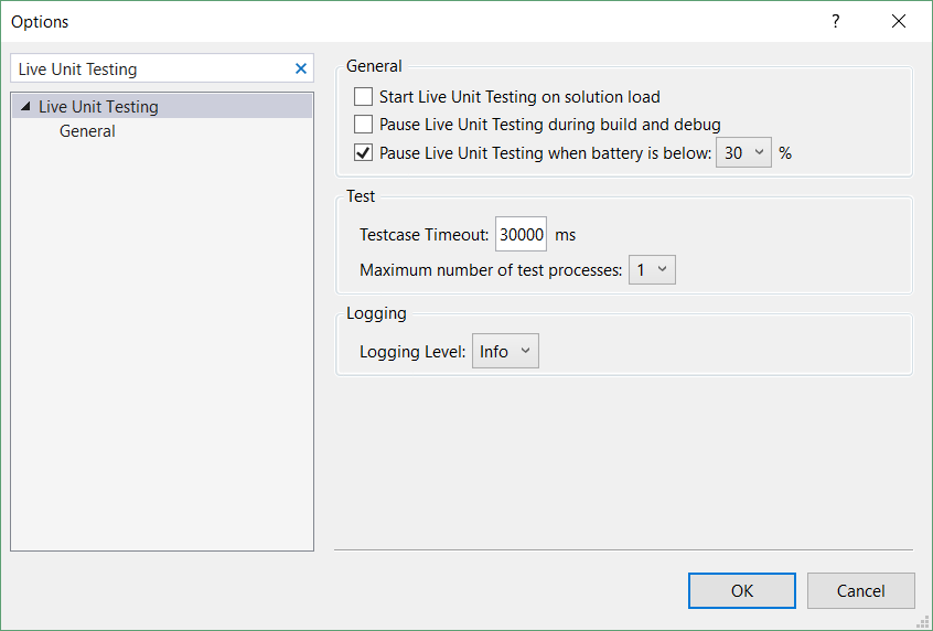 - The Live Unit Testing log information written to the output window. Options include no logging (None), error messages only (Error), error and informational messages (Info – this is the default), or all detail (Verbose).