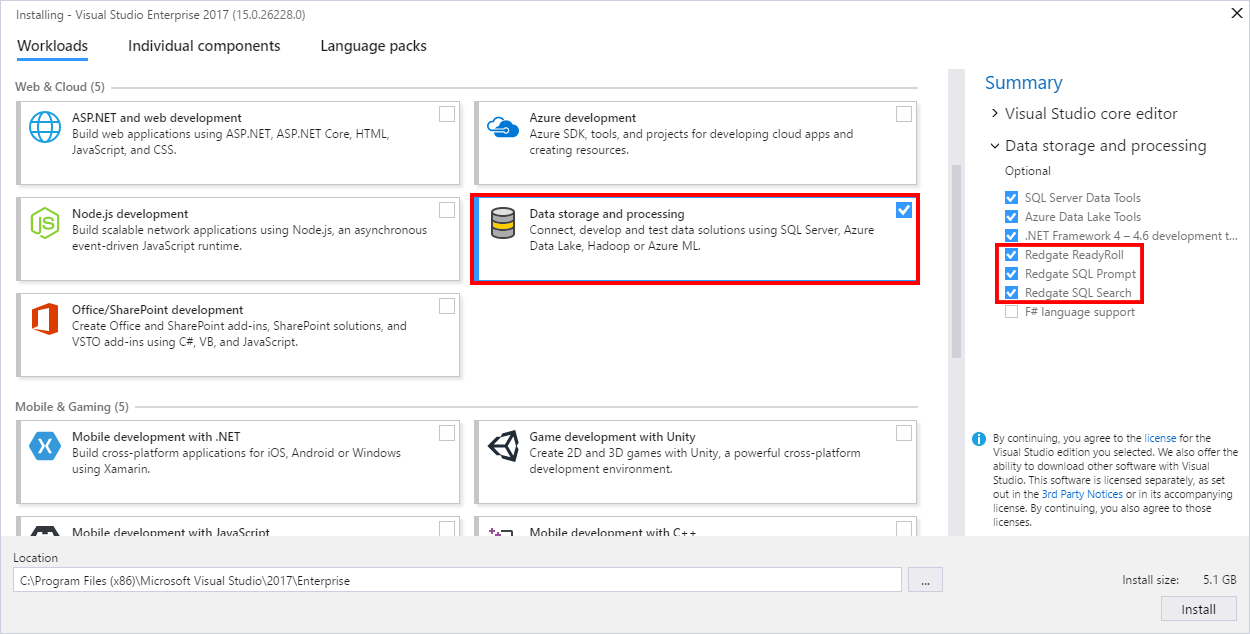 You can install Redgate Data Tools using the Visual Studio Installer through the Data storage and processing workload or through the Individual components tab.