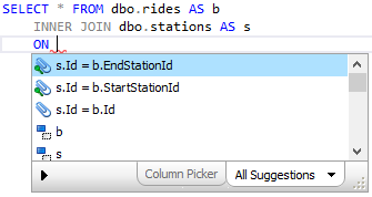 - Suggestions for joins – SQL Prompt can complete join statements for you automatically and suggest possible joins based on foreign key relationships or column similarities as you type.